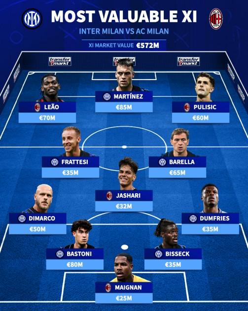 北京时间11月24日,AC米兰在本赛季首回合的米兰德比中1-0击败了同城死敌国际米兰,与此同时德转则列出了目前米兰双雄最贵的11人阵容,身价8500万欧元的劳塔罗和身价7000万欧元的莱奥领衔。